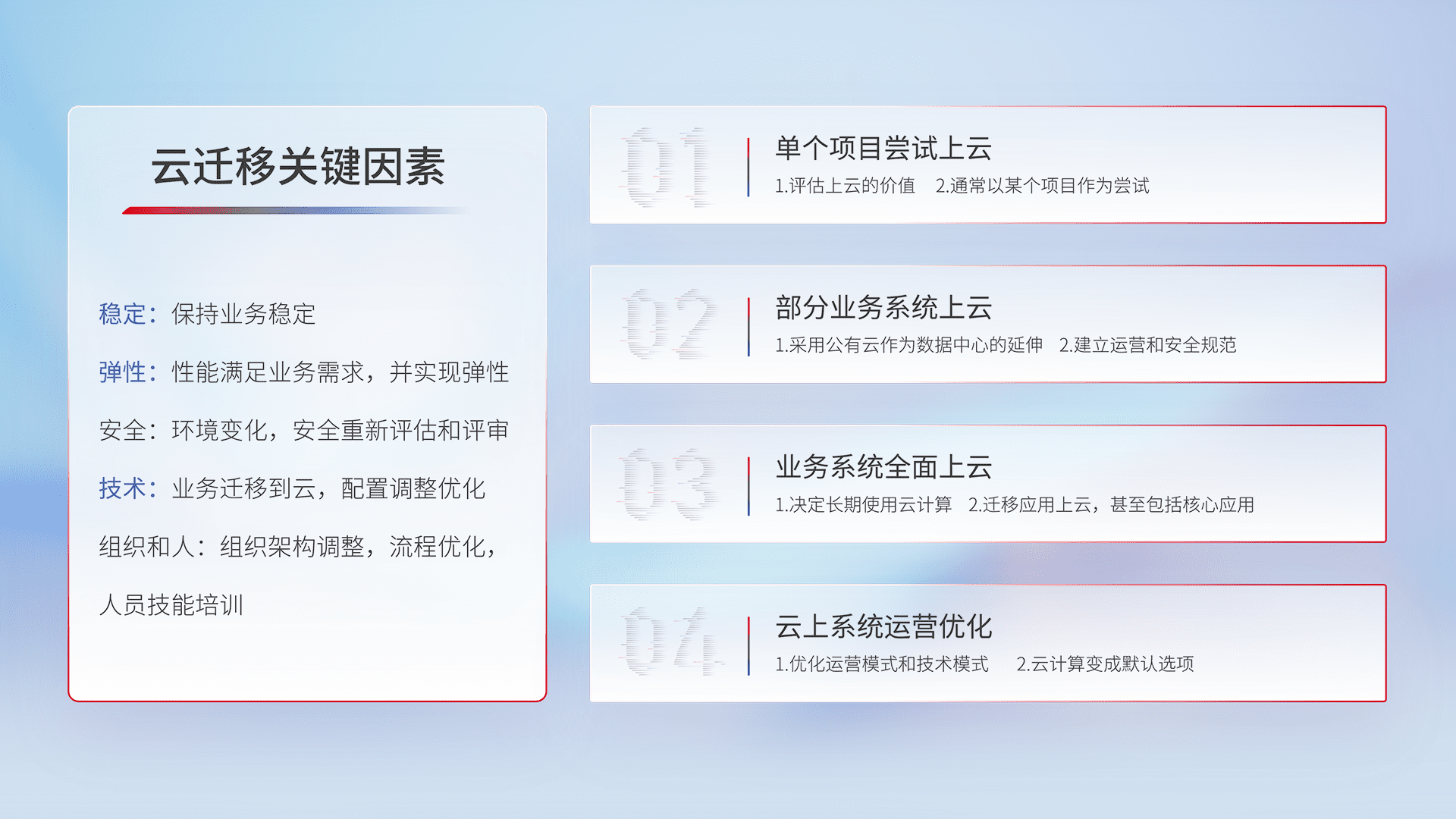 结合实际业务,,,从规划设计、、、、云平台选型、、、云原生改造、、数据迁移、、、、集成交付,,,迁移全过程为客户识别最佳上云路径,,,,做好风险识别管理,,,,设计网络架构、、身份权限、、、、安全审计合规、、、、操作审计、、、、日志审计、、、监控告警策略、、多站点容灾设计等,,对云上基础设施进行整体规划,,,提升IT治理水平,,,,以满足弹性、、高可用、、高性能的需求。。。
