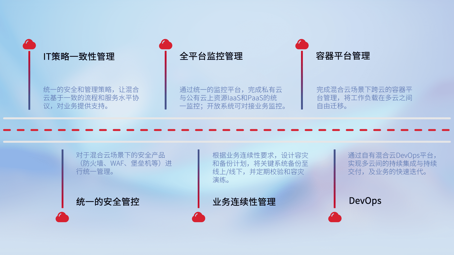 通过多云纳管,,以统一的资源数据模型把客户的云资源进行抽象和封装,,,进而实现对多云资源的统一操作,,,保障云资源管理的可靠性、、、、稳定性与可用性。。。量身定制化运维内容,,,配置、、、开发运维、、、、补丁管理、、备份、、监控、、、、认证和访问管理、、、、审计和日常巡检等,,,,保障在用云过程中的可靠度,,,,稳定度以及高可用率。。。。